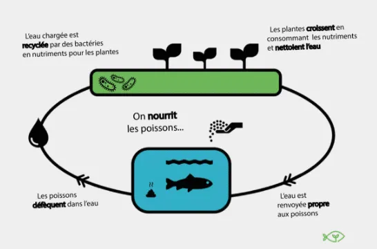 - Des bactéries : Ce sont elles qui transforment l’ammoniac présent dans les excréments du poisson en nitrates, assimilés par les plantes. C’est en absorbant ces nitrates que vos plantes pourront grandir joyeusement et nettoyer à bloc l’eau des poissons ! L’eau retourne alors dans l’aquarium et l’opération peut recommencer de plus belle.